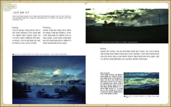 ¿©Çà»çÁøÀÇ ¹é¹Ì! dz°æ »çÁøÀÇ À籸¼º ¸ðµç »çÁø¿¡ ÀÖ¾î¼ ±¸µµ´Â ¸Å¿ì Áß¿äÇÑ ¿ä¼ÒÀÌÁö¸¸, ƯÈ÷ dz°æ »çÁø¿¡ ÀÖ¾î ±¸µµ¸¦ »©³õ°í´Â Àß ÂïÀº dz°æ »çÁøÀ» ¸»ÇϱⰡ ½±Áö ¾Ê´Ù. ±¸µµ¿¡ ÀÖ¾î ¸ð¹ü ´ä¾È°ú °°ÀÌ °¢°¢ÀÇ »óȲ¿¡ ¸Â´Â ¿Ïº®ÇÑ ±¸¼º ¹æ¹ýÀÌ Á¸ÀçÇÏ´Â °ÍÀº ¾Æ´ÏÁö¸¸ ÁÁÀº ±¸¼º¿¡ ´ëÇÑ ¿Ã¹Ù¸¥ °³³äÀ» °¡Áö°í, ±× °³³ä¿¡ ±âÃÊÇØ¼ »çÁøÀ» ¿¬½ÀÇÏ¸ç ´Ù¾çÇÑ °æÇèÀ» ½×¾Æ°¥ ¶§ ¸ÚÁø »çÁøÀ» ¾òÀ» È®·üÀº Á¡Á¡ Ä¿Áö°Ô µÉ °ÍÀÌ´Ù. óÀ½ ¶¥¿¡¼ ÆÄ³ÂÀ» ¶§ ¾Æ¹«·± º¼Ç°¾ø´ø ¿ø¼®ÀÌ º¸¼® ¼¼°ø»çÀÇ ¼ÕÀ» °ÅÃÄ ´«ºÎ½Ã°Ô ºû³ª´Â ´ÙÀ̾Ƹóµå°¡ µÇµíÀÌ, ÆÄÀδõ¸¦ ÅëÇØ ¿ø¼®°ú °°Àº dz°æÀ» ¹Ù¶óº¸°í, °¡°øµÇÁö ¾ÊÀº 3Â÷¿øÀÇ °ø°£À» ¾î¶»°Ô ´Ùµë°í ±¸¼ºÇÏ¿© º¸¼® °°Àº »çÁøÀ¸·Î ¸¸µé¾î³¾Áö´Â ¼ÅÅ͸¦ ´©¸£´Â ÃÔ¿µÀÚÀÇ ¸òÀÌ´Ù. Ä«¸Þ¶ó´Â ´«¾Õ¿¡ º¸ÀÌ´Â ¸ðµç °ÍÀ» ¹«Â÷º°ÀûÀ¸·Î ´ã¾Æ³»±â ¶§¹®¿¡ ÃÔ¿µÀÚ´Â °¡°øµÇÁö ¾ÊÀº Àå¸éÀ» ¶Ñ·ÇÇÑ ÁÖÁ¦¿Í ¹ÌÇÐÀÇ ÇÁ·¹ÀÓÀ¸·Î Á¤¸®ÇØ¾ß ÇÑ´Ù.