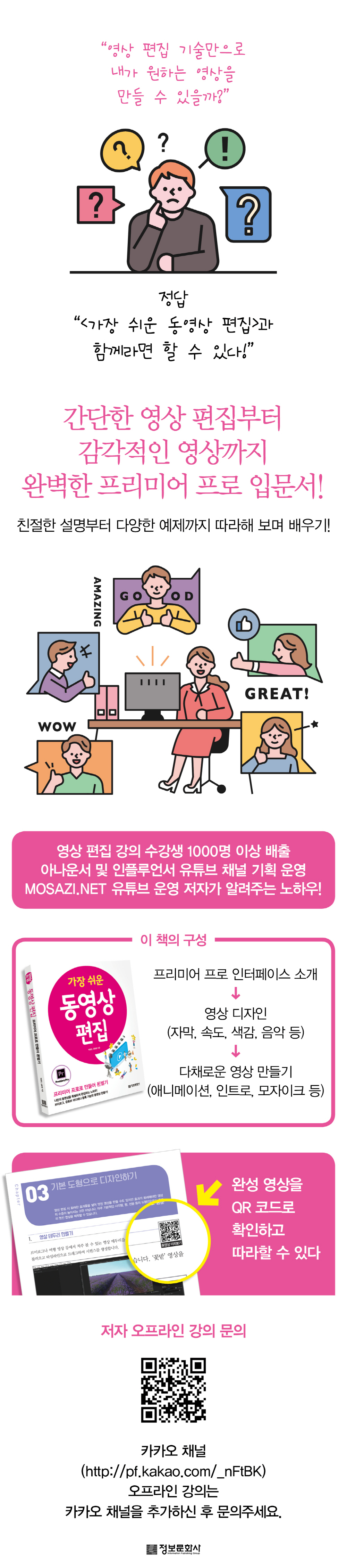 ÃÖ±Ù µ¿¿µ»ó ÆíÁýÀº ¸ðµÎ¿¡°Ô Æò¹üÇÑ ÀÏ»óÀÌ µÇ¾î ´Ù¾çÇÑ °­ÀÇ¿Í µµ¼­µéÀ» ½±°Ô ¸¸³ªº¼ ¼ö ÀÖ´Ù. ±×·¯³ª ÀÌ Ã¥Àº õ ¸í ÀÌ»óÀÇ ¼ö°­»ýÀ» ¹èÃâÇÑ Çö¾÷ÀÇ °­»ç°¡ Á÷Á¢ ¼³¸íÇϱ⠶§¹®¿¡ ½ÃÀÛÇÏ´Â »ç¶÷µéÀÇ ±Ã±ÝÁõÀ» ´©±¸º¸´Ù Àß ¾Ë°í ¼³¸íÇØ ÁÖ°í ÀÖ´Ù. ÇÁ¸®¹Ì¾î ÇÁ·Î ÇÁ·Î±×·¥À» ÀÌ¿ëÇÏ¿© µ¿¿µ»óÀ» ÆíÁýÇÏ°í ½Í´Ù¸é, ±×·¯³ª ³Ê¹« µÎ²¨¿î Ã¥Àº ºÎ´ã½º·´´Ù¸é ¹Ù·Î ÀÌ Ã¥ÀÌ °¥ÁõÀ» ÇØ¼ÒÇØ ÁÙ °ÍÀÌ´Ù. ±âÃÊÀûÀ¸·Î °¡Àå ¸¹ÀÌ »ç¿ëÇÏ´Â ±â´Éµé¸¸ »Ì¾Æ¼­ Á÷Á¢ ½Ç½ÀÇØ º¼ ¼ö ÀÖÀ¸¸ç, ¿Ï¼º ¿µ»óÀ» QR Äڵ带 ÅëÇØ ¹Ì¸® È®ÀÎÇØº¼ ¼ö Àֱ⠶§¹®¿¡ ÇÁ·Î±×·¡¹Ö¿¡ ´ëÇÑ ¸·¿¬ÇÔ ¶ÇÇÑ »ç¶óÁø´Ù. Ã¥À» µû¶ó Çϱâ À§ÇÑ ¿¹Á¦´Â Á¤º¸¹®È­»ç ȨÆäÀÌÁö(infopub.co.kr) ÀÚ·á½Ç¿¡¼­ ´Ù¿î·Îµå °¡´ÉÇϸç, ÇнÀ Áß ±Ã±ÝÇÑ »çÇ×Àº ÀúÀÚ°¡ ¿î¿µÇÏ´Â ºí·Î±×(blog.naver.com/pineappleblind)¿¡¼­ Çǵå¹éÇÒ ¼ö ÀÖ´Ù. ±×¸®°í ¿ÀÇÁ¶óÀÎ °­ÀÇ(taling.me/Talent/Detail/6587)µµ ÁøÇàÇϰí ÀÖÀ¸¹Ç·Î µµ¼­ ³»¿ë ÀÌ¿ÜÀÇ ±Ã±ÝÇÑ »çÇ×Àº ¼ö¾÷À¸·Î ÇØ°áÇÒ ¼ö ÀÖ´Ù. ƯÈ÷ µµ¼­ ±¸¸ÅÀÚ¸¸ 1+1 ¼ö°­±ÇÀÌ Áö±ÞµÇ±â ¶§¹®¿¡ Áö±Ý ´çÀå µ¿¿µ»ó ÆíÁýÀÌ ÇÊ¿äÇÏ´Ù¸é ¼±ÅÃÇØ¾ß ÇÒ µµ¼­ÀÌ´Ù.