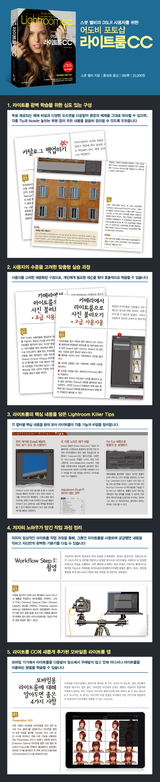 ¶óÀÌÆ®·ë 1.0À» ½ÃÀÛÀ¸·Î, ½ºÄà Ä̺ñÀÇ °¢Á¾ »çÁø Àú¼­´Â Ãâ°£ ÀÌÈÄ ²ÙÁØÈ÷ º£½ºÆ®¼¿·¯ÀÇ ÀÚ¸®¸¦ ÁöÄÑ¿À°í ÀÖ´Ù. ÀúÀÚ´Â ¡®The Lightroom Show¡¯¿Í ¼¼¹Ì³ª¸¦ ÁøÇàÇÏ¸ç »ç¿ëÀÚµéÀÌ ¹«¾ùÀ» ¾î·Á¿öÇÏ´ÂÁö, ¶Ç ¹«¾ùÀ» ±Ã±ÝÇØ ÇÏ´ÂÁö ¿Ïº®È÷ ÆÄ¾ÇÇϰí ÀÖ´Ù. À̸¦ ÅëÇØ ´Ü¼øÈ÷ ½½¶óÀÌ´õÀÇ ±â´É¸¸ ¼³¸íÇÏ´Â ´ë½Å, Á÷Á¢ °æÇèÀ» ÅëÇØ Å͵æÇÑ ¼³Á¤°ú Å×Å©´Ð, ÀÛ¾÷ °úÁ¤À» ³ëÇϿ츦 ³¹³¹ÀÌ °ø°³ÇÑ´Ù. ÀÌ Ã¥Àº Áö±Ý±îÁö ¶óÀÌÆ®·ë »ç¿ëÀÚµéÀÌ ¾È°í ÀÖ´ø °¢Á¾ ¹®Á¦¿Í ±Ã±ÝÁõ¿¡ ´ëÇÑ ÇØ´äÀÌ µÉ °ÍÀÌ´Ù.