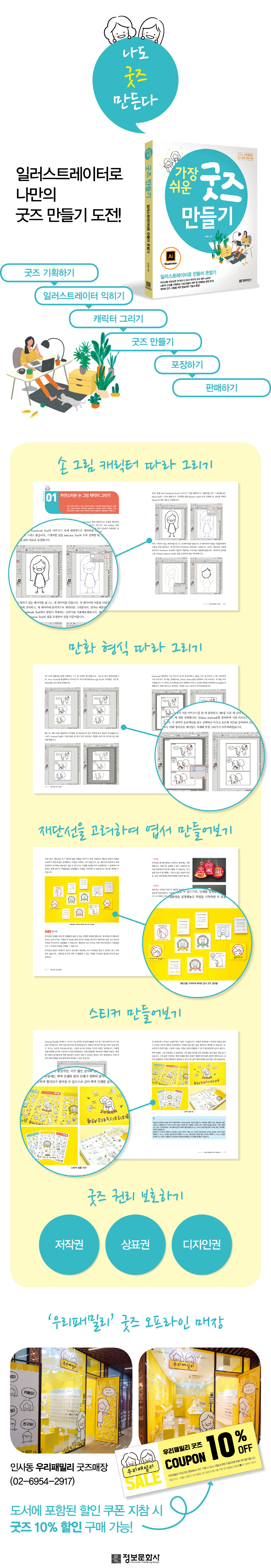 ÃÖ±Ù ¿¬¿¹ÀÎÀ̳ª ¾Ö´Ï¸ÞÀÌ¼Ç µî°ú °ü·ÃµÈ Á¦Ç°ÀÎ ±ÂÁ ¸¹ÀÌ ¼ÒºñÇϰí ÀÖÁö¸¸, ÀÌ´Â ÃÊ»ó±ÇÀ̳ª ÀúÀÛ±ÇÀ» À§¹èÇÏ´Â °æ¿ì°¡ ¹ß»ýÇÒ ¼ö ÀÖ´Ù. ±×·¡¼ ÀÌ Ã¥¿¡¼´Â ³»°¡ ±×¸®°í ½ÍÀº ³ª¸¸ÀÇ Ä³¸¯Å͸¦ ÀÏ·¯½ºÆ®·¹ÀÌÅÍ·Î ¸¸µé¾î ±ÂÁî·Î Á¦ÀÛÇϰí, ÆÇ¸ÅÇϱâ±îÁöÀÇ ¸ðµç °úÁ¤À» ´ã¾Ò´Ù. īī¿ÀÅå À̸ðƼÄÜ ¡®ÀÌ°Å¸é ´Ù µÇÁö¡¯ ÀÛ°¡°¡ óÀ½ºÎÅÍ °ÞÀº ½ÃÇàÂø¿À¿Í ½ÇÀü ³ëÇϿ츦 Ãʺ¸ÀÚµµ ½±°Ô ÀÌÇØÇÒ ¼ö ÀÖ°Ô ¼Ò°³ÇÏ¿´À¸¸ç, ´Ù¾çÇÑ ÆË¾÷ ½ºÅä¾î ¹× ¿ÀÇÁ¶óÀÎ ¸ÅÀå °æ¿µ °æÇèÀ» ¹ÙÅÁÀ¸·Î ½ÃÀÛÇÏ´Â »ç¶÷µé¿¡°Ô À¯¿ëÇÑ Á¤º¸¸¦ Á¦°øÇØÁØ´Ù. ƯÈ÷ Àλ絿¿¡ À§Ä¡ÇÑ ÀúÀÚÀÇ ¡®¿ì¸®ÆÐ¹Ð¸®¡¯ ¸ÅÀå¿¡ ¹æ¹®ÇÏ¿© ´Ù¾çÇÑ ±ÂÁ Á÷Á¢ º¸°í °æÇèÇØ º¼ ¼ö ÀÖÀ¸¸ç, Ã¥¿¡ Æ÷ÇÔµÈ ÄíÆùÀ» ÁöÂüÇÏ¸é ±ÂÁî ±¸¸Å ½Ã ÇÒÀεµ °¡´ÉÇÏ´Ù.