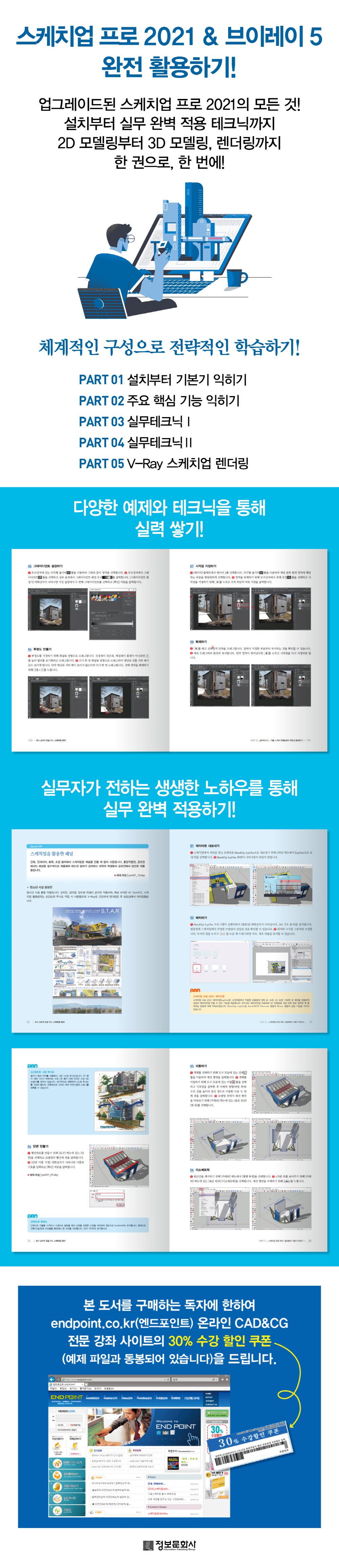 ½ºÄÉÄ¡¾÷ ÇÁ·Î(SketchUp Pro) 2021Àº Àü¹®°¡¸¦ À§ÇÑ 3D ¸ðµ¨¸µ ¼Ö·ç¼ÇÀ¸·Î, µðÀÚÀÌ³Ê¿Í ¼³°èÀÚµéÀ» À§ÇÑ ÃÖÀûÀÇ ±×·¡ÇÈ ÇÁ·Î±×·¥ÀÌ´Ù. »ç¿ëÀÚ°¡ ´õ ÆíÇϰÔ, ´õ °¨°¢ÀûÀ¸·Î »ç¿ëÇÒ ¼ö ÀÖµµ·Ï ¾÷±×·¹À̵åµÈ 2021 ¹öÀüÀ¸·Î µ¹¾Æ¿Ô´Ù. ÀÌ Ã¥Àº ½ºÄÉÄ¡¾÷ ÇÁ·Î 2021ÀÇ ¼³Ä¡ºÎÅÍ 3D ¸ðµ¨¸µ Á¦ÀÛ¿¡ ÇÊ¿äÇÑ ÇÙ½É ±â´É, °Ç¹° ½ºÄÉÄ¡ ¸ðµ¨¸µºÎÅÍ Æ÷Åä¼¥ ÇÕ¼ºÇϱâ, À¥Å÷°ú ÀÎÅ׸®¾î ¸ðµ¨¸µ, Ư¼ö ±â´É Ȱ¿ë, ½ºÄÉÄ¡¾÷ ¿ÜºÎ ÇÁ·Î±×·¥ÀÎ V-Ray ·»´õ¸µ±îÁö °ñ°í·ç ´Ù·ç°í ÀÖ´Ù. °ÇÃà µðÀÚÀ̳Ê, ÀÎÅ׸®¾î µðÀÚÀ̳Ê, Á¦Ç° µðÀÚÀ̳Ê, Åä¸ñ µðÀÚÀ̳Ê, »ê¾÷ µðÀÚÀÎ Á¾»çÀÚ, ȯ°æ µðÀÚÀÎ, °ø°ø µðÀÚÀÎ, ±â°è, ÀüÀÚ µî ´Ù¾çÇÑ ºÐ¾ß Á¾»çÀÚµéÀÇ È¸»ç ½Ç¹«¿¡ ÈûÀ» ½Ç¾îÁÙ ¾È³»¼­ÀÌ´Ù. ½ºÄÉÄ¡¾÷ÀÇ ±âº»ÀûÀÎ ±â´É ÆÄ¾ÇºÎÅÍ Â÷±ÙÂ÷±Ù ÀÍÈ÷µµ·Ï ±¸¼ºµÇ¾î źźÇÏ°Ô ½Ç·ÂÀ» ½×À» ¼ö ÀÖ´Â ¹ßÆÇÀ» Á¦°øÇÑ´Ù. ´Ü°èÀûÀ¸·Î ±¸¼ºµÇ¾î Àֱ⠶§¹®¿¡ ÈĹݺηΠ°¥¼ö·Ï ¾î·Á¿ò¿¡ ºÀÂøÇÒ ¼ö ÀÖÁö¸¸, ÀÌ Ã¥À» ³¡±îÁö µû¶ó°£´Ù¸é ¾î´À»õ ½ºÄÉÄ¡¾÷ ÇÁ·Î 2021À» ´Ù·ç´Â ±â¼úÀÌ Çâ»óµÇ¾î ÀÖÀ½À» ±ú´ÞÀ» ¼ö ÀÖÀ» °ÍÀÌ´Ù.