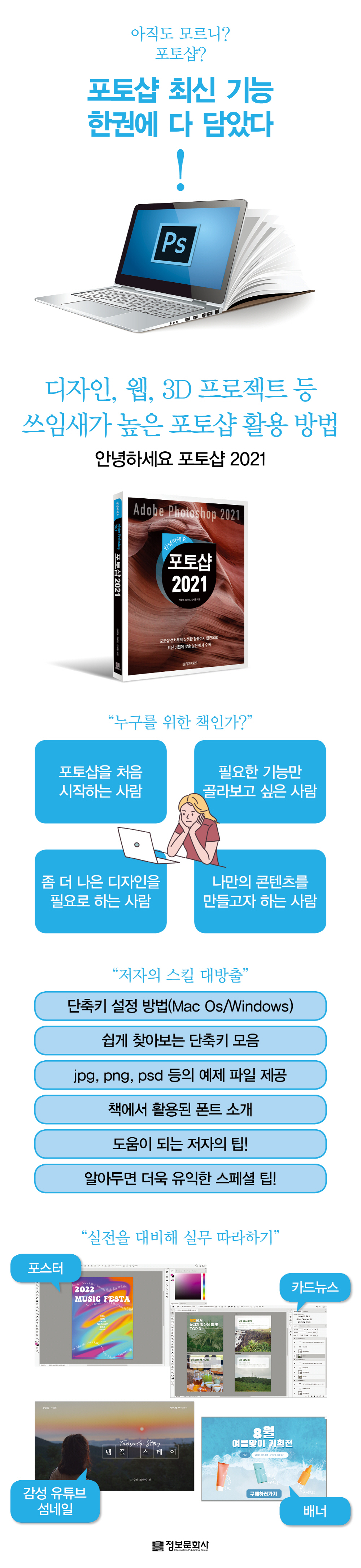 °¡Àå º¸ÆíÀûÀ¸·Î »ç¿ëµÇ´Â Æ÷Åä¼¥À» óÀ½ ½ÃÀÛÇÒ ¼ö ÀÖµµ·Ï ¼³Ä¡ºÎÅÍ ¾È³»ÇÏ´Â ÀÌ Ã¥¿¡¼´Â ÇÙ½É ±â´É¸¸ ¾È³»Çϱ⠶§¹®¿¡ Áö·çÇÑ ¸Å´º¾ó Ã¥µé°ú´Â Â÷º°¼ºÀÌ ÀÖ´Ù. ±âº»ÀûÀ¸·Î ÀÌÇØÇØ¾ß ÇÒ ÆÐ³ÎÀ̳ª ·¹ÀÌ¾î µîÀ» Áß½ÉÀ¸·Î ½Ç¹«¿¡¼ ÀÚÁÖ È°¿ëÇÏ´Â ±â´É¸¸ ´Ù·ç¾ú±â ¶§¹®¿¡ µÎ²®Áö ¾Ê¾Æ Áö·çÇÏÁö ¾Ê°Ô ¹è¿ï ¼ö ÀÖ´Ù. ÇÙ½É ±â´ÉÀ» ¼½¼Çº°·Î ³ª´©¾î ¼³¸íÇÑ µÚ °í±Þ ±â´ÉÀÎ ¾Ö´Ï¸ÞÀ̼ÇÀ¸·Î ¸¸µé¾î º¸°í, µ¿¿µ»ó ÆíÁý±îÁö ¾Ë·ÁÁØ´Ù. ƯÈ÷ ¿äÁò ¸¹ÀÌ È°¿ëµÇ´Â À¯Æ©ºê ¼¶³×ÀÏÀ» ¸¸µå´Â ¹æ¹ýÀ̳ª ÀÚ¿µ¾÷ÀÚµéÀÌ Á÷Á¢ ¸¸µé¾î º¼ ¼ö ÀÖ´Â ¸Þ´ºÇü ¸®Ç÷¿°ú ¹è³Ê, È«º¸Çü Ä«µå´º½º±îÁö Á÷Á¢ ÇØº¼ ¼ö Àֱ⠶§¹®¿¡ Â÷ÈÄ º»ÀÎÀÌ È°¿ëÇÏ¿© Á» ´õ ´Ù¾çÇÏ°Ô Ç¥ÇöÇÒ ¼ö ÀÖ°Ô µÈ´Ù. ±×¸®°í ¿¹Á¦¸¦ µû¶óÇÒ ¼ö ÀÖµµ·Ï ÆÄÀÏÀ» Á¦°øÇÔ°ú µ¿½Ã¿¡ ´Ù¾çÇÏ°Ô È°¿ëµÇ´Â ¹«·á ÆùÆ®µµ ¾È³»ÇØÁØ´Ù. ¸Æ°ú PC ¸ðµÎ Ȱ¿ë °¡´ÉÇÑ Æ÷Åä¼¥À» Á» ´õ ºü¸£°Ô ½ÀµæÇϱâ À§ÇÑ ´ÜÃà۸¦ Á¤¸®ÇØÁֱ⠶§¹®¿¡ ½Ã°£ Àý¾àÀº ¹°·Ð °í±Þ ½ºÅ³±îÁö ¿¬¸¶ÇÒ ¼ö ÀÖ´Ù.