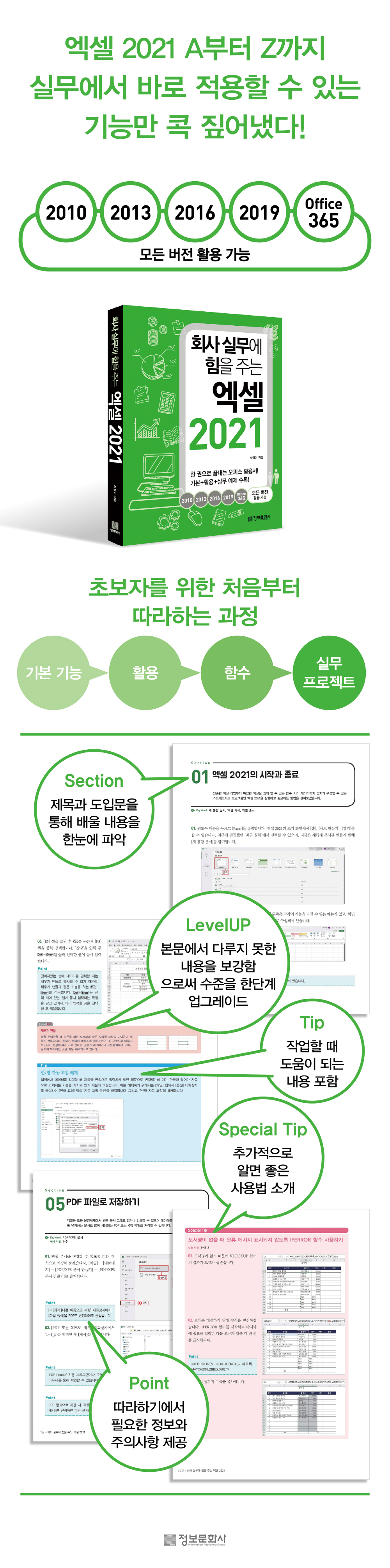 ÀÌ Ã¥Àº Ãʺ¸ÀÚµµ ¹Ù·Î ½ÃÀÛÇÒ ¼ö ÀÖµµ·Ï ±âº», Ȱ¿ë, ÇÔ¼ö, ½Ç¹«ÀÇ 4°³ÀÇ ÆÄÆ®·Î ³ª´©¾î ÃÑ 165°³ÀÇ ¿¹Á¦·Î ¼³¸íÇϰí ÀÖ´Ù. ÃֽŠ¿¢¼¿ 2021ÀÇ È¸é ±¸¼ººÎÅÍ ÀԷ°ú Ãâ·ÂÀÇ µ¥ÀÌÅÍ È°¿ë, Ç¥½Ã ¹æ½Ä µîÀ» ±âº» ¿¹Á¦·Î ¹è¿öº¸°í, µ¥ÀÌÅ͸¦ Ȱ¿ëÇÏ¿© Â÷Æ®·Î Ç¥½ÃÇϱâ, ÇÊÅÍÇϱâ, Çǹþ Â÷Æ® ¸¸µé±â, Àý´ë »ó´ë ÂüÁ¶ ¸ÅÅ©·Î ±â·Ï µîÀÇ È°¿ë ¹üÀ§·Î µé¾î°£´Ù. ±×´ÙÀ½ ¿¢¼¿ÀÇ ²É ÇÔ¼ö·Î ³Ñ¾î°¡´Âµ¥, Ű¿öµå¿Í ±â´ÉÀ» ¾Õ¼ º¸¿©ÁÖ°í ÇÔ¼ö Çü½Ä°ú Àμö, ¼ö½Ä µîÀ» ÀÚ¼¼ÇÏ°Ô ¼³¸íÇÔÀ¸·Î½á ¾î·Á¿î ¼ýÀڿ͵µ Ä£ÇØÁú ¼ö ÀÖ´Ù. ¸¶Áö¸·À¸·Î ȸ»ç ½Ç¹«¿¡¼ °¡Àå ¸¹ÀÌ »ç¿ëÇÏ´Â º¸°í¼, Áý°èÇ¥, µ¥ÀÌÅÍ Àϰý Á¤¸®, ºÐ¼® Â÷Æ® Ç¥ÇöÇϱ⠵îÀ» ÇÁ·ÎÁ§Æ® Çü½ÄÀ¸·Î ÇØº½À¸·Î½á º»Àο¡°Ô ÇÊ¿äÇÑ ±â´ÉÀ» Á÷Á¢ ã¾Æ ¾÷±×·¹À̵åÇØ º¼ ¼ö ÀÖ´Ù. ¾ÕºÎºÐ¿¡ °¡Àå ¸¹ÀÌ »ç¿ëµÇ´Â ±â´ÉµéÀ» ¸ð¾Æ »¡¸® ã¾Æº¼ ¼ö ÀÖµµ·Ï ÆäÀÌÁö·Î Ç¥½ÃÇÏ¿´±â ¶§¹®¿¡ ¹Ù·Î¹Ù·Î ã¾Æ ÀûÀçÀû¼Ò¿¡ Ȱ¿ëÇÒ ¼ö ÀÖ´Ù.