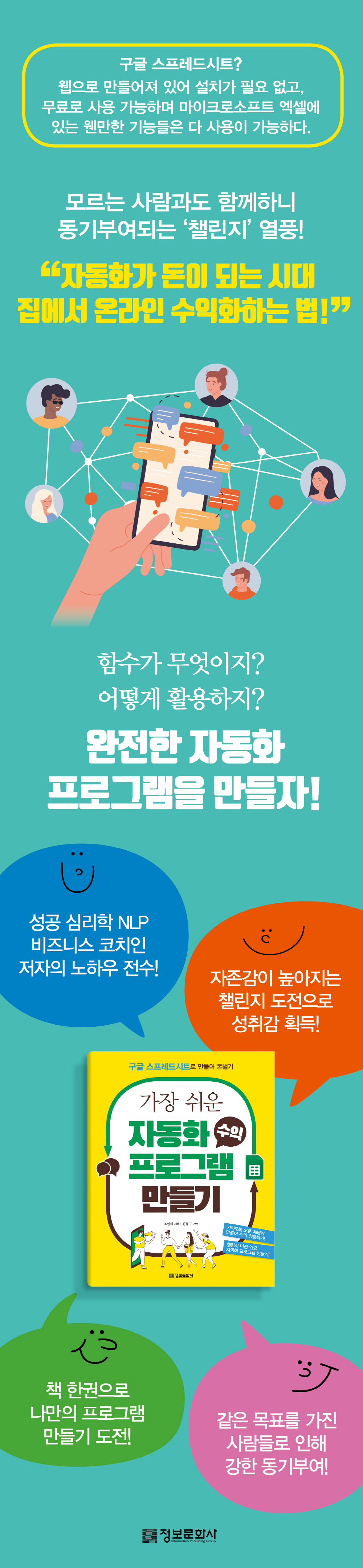 īī¿ÀÅå ¿ÀÇ äÆÃ¹æÀ» Ȱ¿ëÇÑ ÀÚµ¿È 縰Áö¸¦ ¿î¿µÇÏ´Â ¹æ¹ýÀ¸·Î ±¸±Û ½ºÇÁ·¹µå½ÃÆ®¿¡ ÃÊÁ¡À» ¸ÂÃá ÀÌ Ã¥Àº ÇÔ¼ö¸¦ ¹è¿ì°í ¼öÀÍÈÇÏ´Â ¹æ¹ýÀ» ÀÚ¼¼ÇÏ°Ô ¾Ë·ÁÁØ´Ù. ±×·¯±â À§ÇØ ÀÚµ¿ÈÀÇ Á߿伺, īī¿ÀÅå ¿ÀÇ äÆÃ¹æ ¿î¿µÇÏ´Â ¹æ¹ý, 縰Áö¸¦ ¿î¿µÇØ¾ß ÇÏ´Â ÀÌÀ¯, ±×¸®°í ½ºÇÁ·¹µå½ÃÆ®°¡ ¿Ö °£´ÜÇϰí Ȱ¿ëÇϱâ ÁÁÀºÁö µîÀ» »ó¼¼È÷ ´Ù·é´Ù. 縰Áö ±âȹ°ú īī¿ÀÅå ¿ÀÇ äÆÃ¹æ ¼³Á¤, ±×¸®°í ±¸±Û ½ºÇÁ·¹µå½ÃÆ®ÀÇ ½ÇÇà°ú ´Ù¾çÇÑ ÁÖ¿ä ÇÔ¼ö Ȱ¿ë¹ýÀ» ´Ü°èº°·Î ¼³¸íÇϸç ÀÚµ¿È ÇÁ·Î±×·¥À» ¸¸µé±â À§ÇÑ ÇÙ½É ±â´ÉÀ» ÀÍÈú ¼ö ÀÖ´Ù. ³¯Â¥¿Í ½Ã°£ µ¥ÀÌÅÍ Ã³¸®, ´Ð³×ÀÓ ÃßÃâ, ´Þ·Â »ý¼º µîÀ» ÅëÇØ ¹Ì¼Ç ÀÎÁõ ÀÚµ¿È ÇÁ·Î±×·¥À» ¿Ï¼ºÇÏ´Â ¹æ¹ýÀ» ´Ù·ç°í, ¸¶Áö¸·À¸·Î 縰Áö¸¦ ÅëÇØ º¯ÈµÇ´Â »îÀÇ ¼±ÅÃ, Àڱ⠹ÏÀ½, ±àÁ¤ÀûÀÎ ¸¶Àε忡 ´ëÇÑ ÀλçÀÌÆ®¸¦ Á¦½ÃÇÑ´Ù. ÀÌ Ã¥Àº µ¶ÀÚ°¡ ±¸±Û ½ºÇÁ·¹µå½ÃÆ®¿Í īī¿ÀÅåÀ» Ȱ¿ëÇÏ¿© 縰Áö¸¦ ÅëÇØ º¯È¸¦ À̲ø¾î ³»´Â µ¥ ÇÊ¿äÇÑ ¸ðµç ´Ü°è¸¦ ¾È³»Çϱ⠶§¹®¿¡ »õ·Î¿î °Í¿¡ µµÀüÇÏ´Â Á¤½Å°ú ¹è¿òÀ» Áñ±â´Â ¸¶À½À¸·Î ¼öÀÍȱîÁö µÎ ¸¶¸® Åä³¢¸¦ ¸ðµÎ ÀâÀ» ¼ö ÀÖ´Ù.