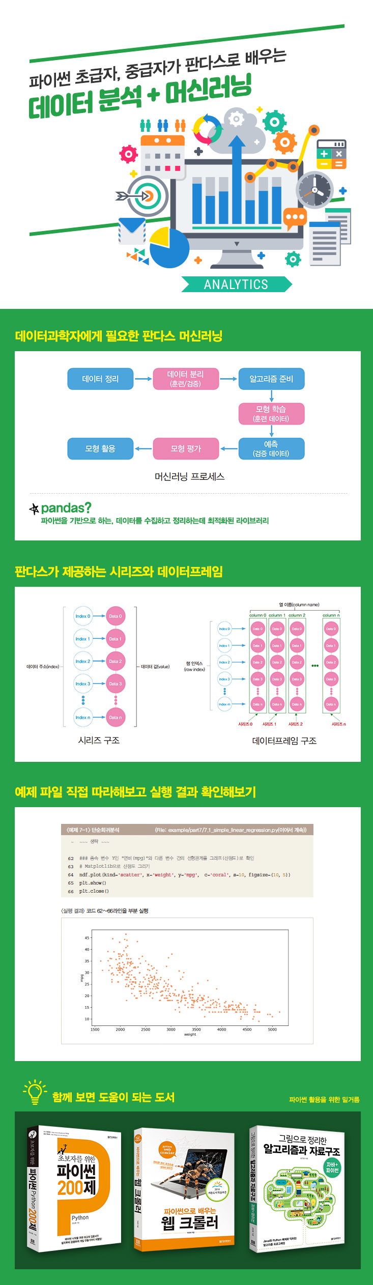 ÆÄÀ̽ã ÃʱÞÀÚ³ª Áß±ÞÀÚ°¡ µ¥ÀÌÅÍ ºÐ¼®°ú ¸Ó½Å·¯´×À» ¹è¿ì°íÀÚ ¸¶À½¸Ô¾ú´Ù¸é ÀÌ Ã¥À» ¼±ÅÃÇØ¾ß ÇÑ´Ù. Çʼö ¶óÀ̺귯¸®¸¦ ¼Ò°³ÇÏ°í ¼³Ä¡ºÎÅÍ ¿¹Á¦ Äڵ带 µû¶ó ÇÏ¸é¼ ÀÚ¿¬½º·´°Ô Àͼ÷ÇØÁöµµ·Ï ¾È³»Çϰí Àֱ⠶§¹®ÀÌ´Ù. ¾î·Á¿ï °Í °°Àº ¼öÇаú Åë°èÇÐÀû ÀÌ·ÐÀº °¡´ÉÇÑ ÇÑ ³·Ãß°í ½Ç½ÀÇϸç ÃÖ¼ÒÇÑÀÇ ¼³¸íÀ¸·Î °á°ú°ª°ú È®ÀÎÇÒ ¼ö ÀÖµµ·Ï ÇÏ¿´´Ù. ¶ÇÇÑ ¹æ´ëÇÑ ÅØ½ºÆ®º¸´Ù´Â ´ÙÀ̾î±×·¥ µî°ú °°Àº µµ½ÄÈ¿¡ ½Å°æÀ» ±â¿ï¿© ÇÑ´«¿¡ ÀÌÇØÇÒ ¼ö ÀÖµµ·Ï ±¸¼ºÇÏ¿´´Ù. ´©±¸³ª µ¥ÀÌÅÍ °úÇÐÀÚ°¡ µÉ ¼ö ÀÖ´Ù. ±× Ãâ¹ß ¼±»ó¿¡ ¼¹´Ù¸é ÀÌ Ã¥°ú ÇÔ²² ¿¹Á¦Äڵ带 Çϳª¾¿ ½ÇÇàÇØº¸¸é, ÆÄÀ̽㠵¥ÀÌÅÍ ºÐ¼®À» Áñ±â°í ÀÖ´Â º»ÀÎÀ» ¹ß°ßÇÒ °ÍÀÌ´Ù.