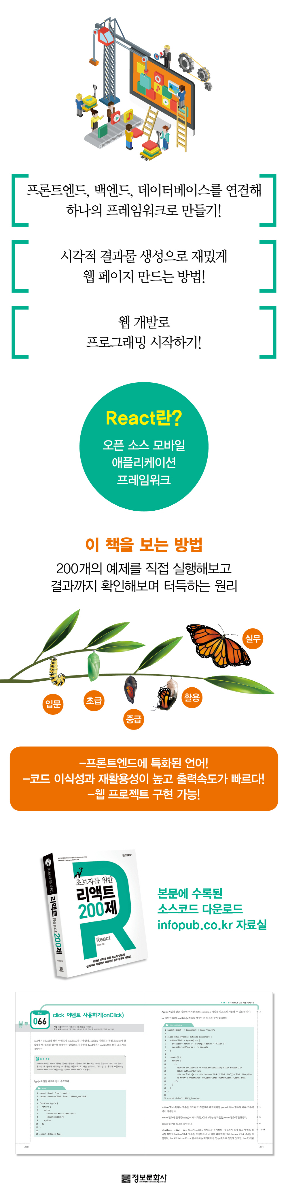 ¸®¾×Æ®¸¦ ½ÃÀÛÇϱâ Àü¿¡ °³¹ß ȯ°æÀ» ÁغñÇÏ´Â °úÁ¤ºÎÅÍ ½ÃÀÛÇÏ¿© ¿¹Á¦ ÆÄÀÏÀ» ½ÇÇàÇÏ´Â ¹æ¹ýÀ» ¾È³»ÇÑ´Ù. ÀÔ¹®ºÎÅÍ ÃʱÞ, Áß±Þ, Ȱ¿ë, ½Ç¹«±îÁö 5°³ÀÇ ÆÄÆ®·Î ³ª´©¾î ´Ü°èº°·Î ½Ç·ÂÀ» Çâ»ó½Ãų ¼ö ÀÖ°Ô ±¸¼ºÇÏ¿´´Ù. ¸®¾×Æ®¿¡¼ »ç¿ëÇÏ´Â ÇÔ¼ö¿Í ¹®¹ý, À¥ ºê¶ó¿ìÀú¿¡ ȸéÀ» ¶ç¿öº¸±â·Î ½ÃÀ۵Ǵ ÀÌ Ã¥Àº º¯¼ö¸¦ °ü¸®Çϰí ÄÄÆ÷³ÍÆ® À¯Çüº°·Î Àå´ÜÁ¡À» ºñ±³Çϰí, ÅÂ±× »ç¿ë ¹× À̺¥Æ® ó¸® ±¸Çöµµ ÇÒ ¼ö ÀÖ´Ù. ¶ÇÇÑ ¿ÜºÎ api¸¦ Ȱ¿ëÇÏ´Â ºÎºÐµµ ÁýÁßÀûÀ¸·Î ´Ù·ç°í, node.js¸¦ »ç¿ëÇÏ¿© DB ¼¹ö¿¡¼ ÀÛ¾÷À» ¼öÇàÇÒ ¼ö ÀÖ´Â ½Ç¹« ´É·Â±îÁö ½Ç½ÀÇÒ ¼ö ÀÖ´Ù. ¿¹Á¦¸¦ 200°³·Î ³ª´©¾î °£´ÜÇÏ°Ô ÇнÀÇÒ ¼ö Àֱ⠶§¹®¿¡ ªÀº ÁÖ±â·Î ¼ºÃë°¨À» ¾òÀ» ¼ö ÀÖÀ¸¸ç, ±â´É À§ÁÖÀÇ ¼³¸íÀ¸·Î ÇÊ¿äÇÑ °³¹ß ½ºÅ³¿¡ ÁýÁßÇÒ ¼ö ÀÖ´Â ÀåÁ¡ÀÌ ÀÖ´Ù. ÀÌ Ã¥À» µû¶ó Çϱâ À§ÇÑ ¿¹Á¦ ÆÄÀÏÀº Á¤º¸¹®È»ç ȨÆäÀÌÁö(infopub.co.kr) ÀÚ·á½Ç¿¡¼ ´Ù¿î·Îµå °¡´ÉÇϰí, ÇнÀ Áß ±Ã±ÝÇÑ »çÇ×ÀÇ ÀúÀÚ È¨ÆäÀÌÁö(leejungyeoul.tistory.com)¿¡¼ Çǵå¹é °¡´ÉÇÏ´Ù.