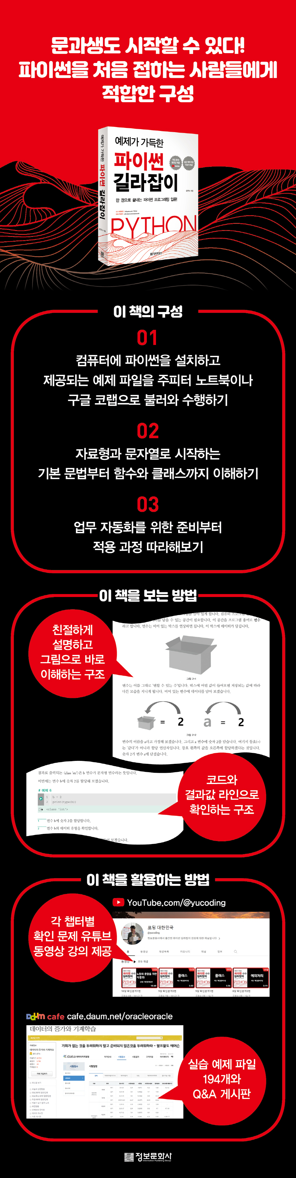 ÀÌ Ã¥Àº ÆÄÀ̽ãÀ» óÀ½ ½ÃÀÛÇÏ´Â »ç¶÷µé¿¡°Ô ¹æÇâÀ» ¹Ù·ÎÀâ¾Æ ³ª¾Æ°¥ ¼ö ÀÖ´Â ±æ¶óÀâÀÌ ¿ªÇÒÀ» ÇÒ °ÍÀÌ´Ù. ³» ÄÄÇ»ÅÍ¿¡ ¼³Ä¡ÇÏ´Â ¹æ¹ýÀ» ȸé ĸó¸¦ ÅëÇØ ¼ø¼´ë·Î ÀÚ¼¼ÇÏ°Ô ¾Ë·ÁÁÖ¸ç, óÀ½ºÎÅÍ Äڵ带 ÀÔ·ÂÇÏ¸ç ¾î·Æ°Ô ´À²¸ÁöÁö ¾Êµµ·Ï ¿¹Á¦ ÆÄÀÏÀ» Á¦°øÇϱ⠶§¹®¿¡ ´Ù¿î·Îµå ¹Þ¾Æ Á÷Á¢ ½ÇÇàÇØ º¼ ¼ö ÀÖ´Ù. ƯÈ÷ ÆÄÀ̽ãÀÇ ½ÃÀÛÀ̶ó°í ÇÒ ¼ö ÀÖ´Â ¹®¹ýÀº ¹®°ú»ýµµ ÀÌÇØÇÒ ¼ö ÀÖµµ·Ï ±×¸²À¸·Î ¿¹·Î µé¾î Ä£ÀýÇÏ°Ô ¼³¸íÇϰí ÀÖÀ¸¸ç, ¿¹Á¦ ¼Ò½ºº° ¶óÀÎÀÇ ¼³¸í°ú °á°ú°ªÀ» ÇÑ´«¿¡ º¼ ¼ö ÀÖµµ·Ï ±¸¼ºÇÏ¿´´Ù. ±×¸®°í ´Ù¾çÇÑ ¿¹Á¦¸¦ Ãß°¡ÀûÀ¸·Î º¸¿©ÁÖ´Â È®ÀÎ ¹®Á¦µéÀº ÀúÀÚ°¡ À¯Æ©ºê¸¦ ÅëÇØ µ¿¿µ»ó °Á¸¦ Á¦°øÇϱ⠶§¹®¿¡ Á» ´õ »ó¼¼ÇÑ ¼³¸íÀ» µéÀ» ¼ö ÀÖ°í ±Ã±ÝÇÑ »çÇ×Àº Çǵå¹éµµ °¡´ÉÇÏ´Ù. ´Ù³â°£ ½Ç¹«¿¡¼ ÄÚµù ±³À°À» ÁøÇàÇϰí ÀÖ´Â ÀúÀÚ°¡ ³ëÇϿ츦 ³ì¿©³õÀº Ã¥À̱⠶§¹®¿¡ Ãʺ¸ÀÚ°¡ ½±°Ô ³õÄ¡´Â ºÎºÐ°ú ²À ¾Ë°í ³Ñ¾î°¡¾ß ÇÒ ºÎºÐµéÀ» ²Ä²ÄÇÏ°Ô Ã¬°Ü³õ¾ÒÀ¸´Ï ¹Ï°í ½ÃÀÛÇØµµ ÁÁÀ» °ÍÀÌ´Ù.
