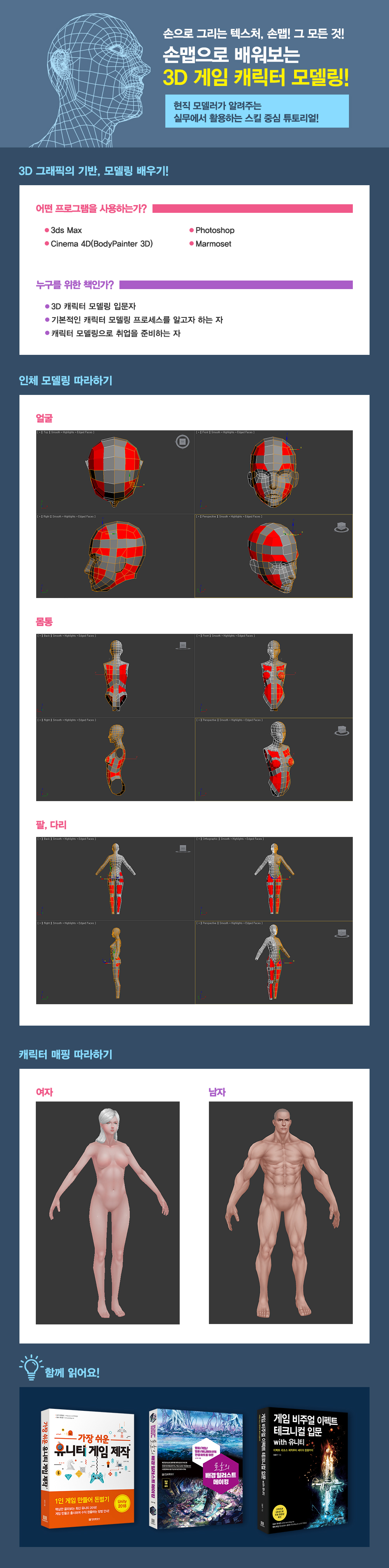 3D ¸ðµ¨¸µÀÇ Á¾·ùÀÎ ³ë¸Ö°ú ¼Õ¸Ê Áß ±×¸²À» ±×¸®´Â °Í°ú °°ÀÌ ¼Õ¿¡ 90% ÀÌ»ó ÀÇÁ¸ÇÏ´Â ¹æ½ÄÀÎ ¼Õ¸ÊÀ» ±âº»À¸·Î ±¸¼ºµÇ¾î ÀÖ½À´Ï´Ù. ÇÁ·Î±×·¥Àº 3D MAX¿Í ¹ÙµðÆäÀÎÆ®, Æ÷Åä¼¥, ¸¶¸ð¼ÂÀ» Ȱ¿ëÇÏ¿© ÁøÇàµÇ´Âµ¥, ±âº»ÀûÀÎ ÀÎÅÍÆäÀ̽º¿Í ¸Þ´º¸¦ ¼³¸íÇÏ°í ¸ðµ¨¸µÀ» ½ÃÀÛÇÕ´Ï´Ù. ƯÈ÷ ÀÎü¸¦ ¾ó±¼, ¸ö, ¼Õ, ¹ß µî ÀÚ¼¼ÇÏ°Ô ³ª´©¾î ¾È³»Çϱ⠶§¹®¿¡ Ãʺ¸ÀÚ¿¡°Ô ¸¹Àº µµ¿òÀÌ µË´Ï´Ù. ¿©ÀÚ¿Í ³²ÀÚ Ä³¸¯Å͸¦ °¢°¢ ¸ÅÇÎÇØº¸±â ¶§¹®¿¡ Â÷ÀÌÁ¡°ú Ư¡µµ ¹è¿ï ¼ö ÀÖ½À´Ï´Ù. ¸¶Áö¸·À¸·Î À̹ÌÁöÈ­ÇÏ´Â ÀÛ¾÷±îÁö ¸¶Ä¡¸é ³ª¸¸ÀÇ Ä³¸¯Å͸¦ ¿Ï¼ºÇغ¼ ¼ö ÀÖ½À´Ï´Ù. óÀ½¿¡´Â Ã¥À» µû¶óÇØ º¸°í ³ªÁß¿¡´Â º¯ÇüÇÏ¿© ÀÚ½ÅÀÌ »ý°¢ÇÑ Ä³¸¯ÅÍ ¸ðµ¨¸µÀ» ¿Ï¼ºÇÒ ¼ö ÀÖ´Â ±âȸ¸¦ ÀÌ Ã¥¿¡¼­ Ã¥ÀÓÁö°í ÀÖ½À´Ï´Ù.