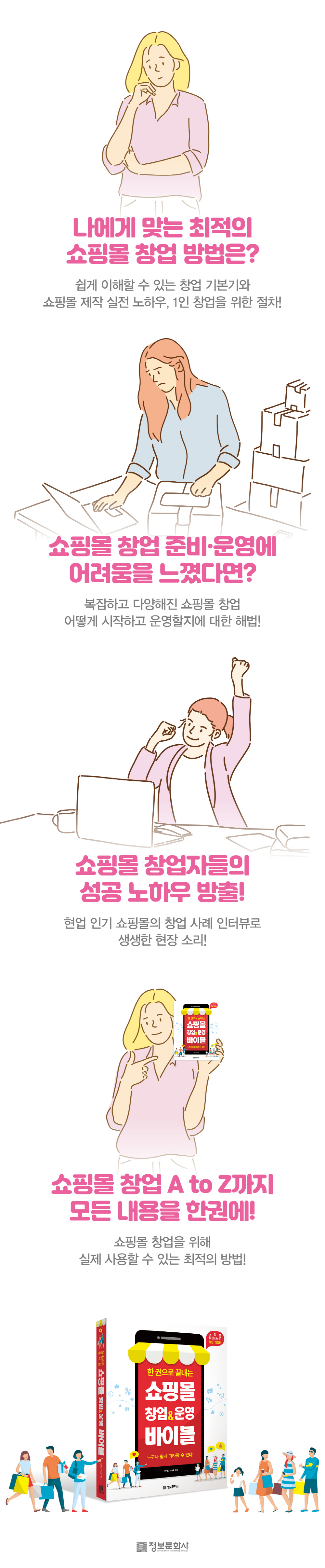 ÀÌ Ã¥Àº ¼îÇθô â¾÷±îÁö¸¦ À§ÇÑ ¸ðµç Çʼö °úÁ¤ÀÌ ´ã°Ü ÀÖ´Ù. óÀ½ ½ÃÀÛÇÏ´Â »ç¶÷µéÀ» À§ÇØ ´Ü°èº°·Î ¼³¸íÇϴµ¥, ½ÃÀåÁ¶»ç ¹× ¾ÆÀÌÅÛ ¼±Á¤ºÎÅÍ ½ÃÀÛÇÏ¿© »ç¾÷°èȹ¼ ÀÛ¼º, µµ¸ÞÀÎ ±¸ÀÔ, ÀÎÇã°¡ °ü·Ã ½Å°í »çÇ×À» ¾È³»ÇÏ°í ´Ù¸¥ ¼îÇθôÀ» º¥Ä¡¸¶Å·ÇÏ¿© ³ª¸¸ÀÇ ¼îÇθôÀ» ±âȹÇÒ ¼ö ÀÖµµ·Ï ÁøÇàµÈ´Ù. ´ëÇ¥ ¼Ö·ç¼ÇÀÎ Ä«Æä24¿Í ¸ÞÀÌÅ©¼¥°ú ´õºÒ¾î ¿äÁò ÇÖÇÑ ³×À̹ö ½º¸¶Æ®½ºÅä¾î±îÁö ¼³¸íÇÔÀ¸·Î½á ÀÔÁ¡ÇÏ¿© °ü¸®ÇÏ°í ¿î¿µÇÏ´Â ¹æ¹ýÀ» »ìÆìº¸°í ¼±ÅÃÇÏ¿© ÁøÇàÇÒ ¼ö ÀÖ´Ù. ƯÈ÷ Ä«Æä24³ª ¸ÞÀÌÅ©¼¥À» ¼±ÅÃÇÒ °æ¿ì ÇØ¿Ü ¼îÇθôÀ» ¼±ÅÃÇÒ ±âȸ°¡ ÁÖ¾îÁö¹Ç·Î ´Ù¾çÇÑ Ã¤³ÎÀ» ¼±ÅÃÇÒ ¼ö ÀÖ´Ù´Â ÀåÁ¡µµ ÀÖ´Ù. ÀÌ Ã¥À» µû¶óÇØ º¼ ¼ö ÀÖ´Â ¿¹Á¦ ÆÄÀÏÀº Á¤º¸¹®È»ç ȨÆäÀÌÁö(infopub.co.kr) ÀÚ·á½Ç¿¡¼ ´Ù¿î·Îµå °¡´ÉÇϸç, Á÷Á¢ Æ÷Åä¼¥ ¹× ÇÁ·Î±×·¥À¸·Î ¿¬½ÀÇØº¸¸é¼ ½Ç·Â Çâ»ó¿¡ ¹Ø°Å¸§ÀÌ µÉ ¼ö ÀÖÀ» °ÍÀÌ´Ù.