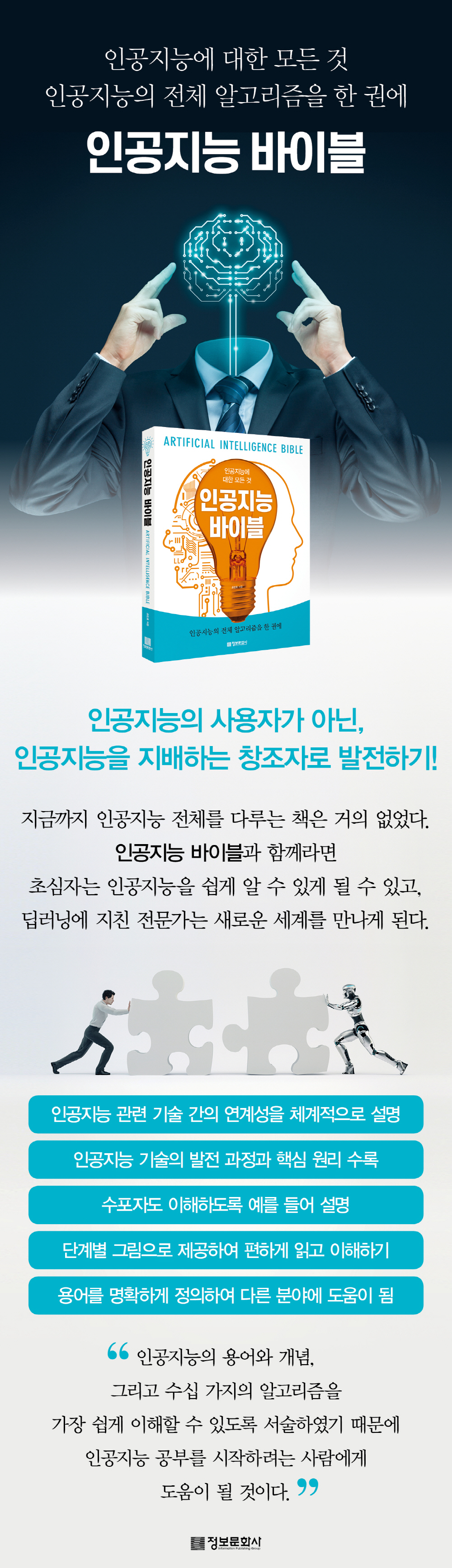 ÀΰøÁö´ÉÀº Àΰ£ÀÇ Áö´ÉÀ» ¸¸µé°í ½Í´Ù´Â ¿å±¸¿¡¼­ ½ÃÀ۵Ǿî ÀÎÁö°úÇÐ, ·Îº¸Æ½½º, ¸Ó½Å·¯´×, ÃÖÀûÈ­ ÀÌ·Ð, ÆÐÅÏ ÀνÄ, ÀÚ¿¬¾î ó¸® µî ´Ù¾çÇÑ ºÐ¾ß¸¦ Æ÷ÇÔÇÑ´Ù. ÃÖ±Ù ÀÚÀ²ÁÖÇà, ±¤°í³ª ´º½ºÀÇ Ãßõ, ÀÚµ¿ ¹ø¿ª, ÀÇ·á Áö¿ø, ´ëÈ­Çü ÇÁ·Î±×·¥, ·Îº¿À» ÀÌ¿ëÇÑ »ý»ê ¹× ¼­ºñ½º, ´ë±Ô¸ð µ¥ÀÌÅÍ ºÐ¼® ½Ã½ºÅÛ µî ´Ù¾çÇÑ ºÐ¾ß¿¡¼­ Ȱ¿ëµÇ°í Àֱ⠶§¹®¿¡ ÇʼöÀûÀÎ Çй®À¸·Î ÀÚ¸® Àâ°í ÀÖ´Ù. ÀÌ Ã¥Àº ÀΰøÁö´É °³·Ð¼­·Î ÃʽÉÀÚ¿¡°Ô ¸¹Àº °ÍµéÀ» Àç¹ÌÀÖ°Ô Àü´ÞÇÒ °ÍÀ̸ç, µö·¯´×¿¡ ÁöÄ£ Àü¹®°¡µé¿¡°Ô´Â »õ·Î¿î ¼¼°è¸¦ º¸¿©ÁÙ °ÍÀÌ´Ù. ƯÈ÷ ÀΰøÁö´ÉÀÇ °ÅÀÇ ¸ðµç ºÐ¾ß¸¦ ÀüüÀûÀ¸·Î ´Ù·ç°í Àֱ⠶§¹®¿¡ °ü·Ã ±â¼ú ¿¬°è¼º¿¡ ´ëÇÑ ·Îµå¸ÊÀ» Á¦½ÃÇÏ¿© Àüü¸¦ ¿¬°áÇϵµ·Ï ü°èÀûÀ¸·Î ¼³¸íÇÑ´Ù. ¶ÇÇÑ ¾î·Æ°Ô ´À³¥ ¼ö ÀÖ´Â ¼ö½ÄÀ̳ª ÇÁ·Î±×·¡¹ÖÀ» ÃÖ¼ÒÈ­ÇÏ¿© °¡º±°í ÆíÇÏ°Ô Àаí ÀÌÇØÇÒ ¼ö ÀÖ´Ù. ±×¸®°í ´Ù¾çÇÑ ºÐ¾ß¿¡¼­ »ç¿ëµÇ´Â ¸¹Àº »ý¼ÒÇÑ ¿ë¾î¸¦ ¸íÈ®ÇÏ°Ô Á¤ÀÇÇÏ°í »ç¿ëÇϱ⠶§¹®¿¡ ÀÌ Ã¥À» ¿Ïµ¶ÇÑ´Ù¸é ÇâÈÄ ´Ù¸¥ ºÐ¾ß¸¦ ÇнÀÇÒ ¶§ Å« µµ¿òÀÌ µÉ °ÍÀÌ´Ù.