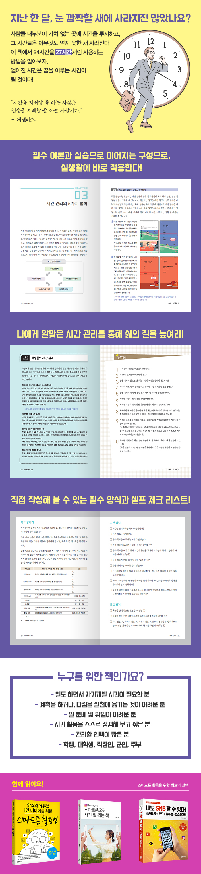 Àڱ⠰ü¸®¸¦ À§ÇÑ Ç³ºÎÇÑ ºÎ·Ï Á¦°ø! °¢ ÆÄÆ® ¸¶Áö¸·¿¡´Â Çлý, ±ºÀÎ, Á÷ÀåÀÎ, ÁֺΠµî ´Ù¾çÇÑ »ç¶÷µéÀÌ ÀÚ½ÅÀÇ ¸ñÇ¥¿Í ²ÞÀ» ¼³Á¤ÇÏ°í »îÀÇ ÁúÀ» ³ôÀÌ¸ç ¼º°øÇÏ´Â »îÀ» »ì ¼ö ÀÖµµ·Ï ½Ã°£ °ü¸® ÆÁÀ» ¼ö·ÏÇÏ¿´À¸¸ç, Ã¥ µÞºÎºÐ¿¡´Â µ·À̳ª ¸ñÇ¥¸¦ °ü¸®ÇÒ ¼ö ÀÖ´Â ¡®Àڱ⠰ü¸®¸¦ À§ÇÑ À¯¿ëÇÑ ¾Û¡¯, ½º½º·Î ½Ã°£ °ü¸®, ¸ñÇ¥, ÀÏÁ¤, ÇÒ ÀÏ, ȸÀÇ, ÀüÈ, ¸ÞÀÏ, ÃâÀå, À§ÀÓ µîÀ» Á¡°ËÇÒ ¼ö ÀÖ´Â ¡®Ã¼Å© ¸®½ºÆ®¡¯, ½Ã°£ °ü¸® ½À°üÀ» ¸¸µé ¼ö ÀÖ´Â ¡®Çʼö ¾ç½Ä 10°¡Áö¡¯¸¦ ¼ö·ÏÇÏ¿´½À´Ï´Ù.